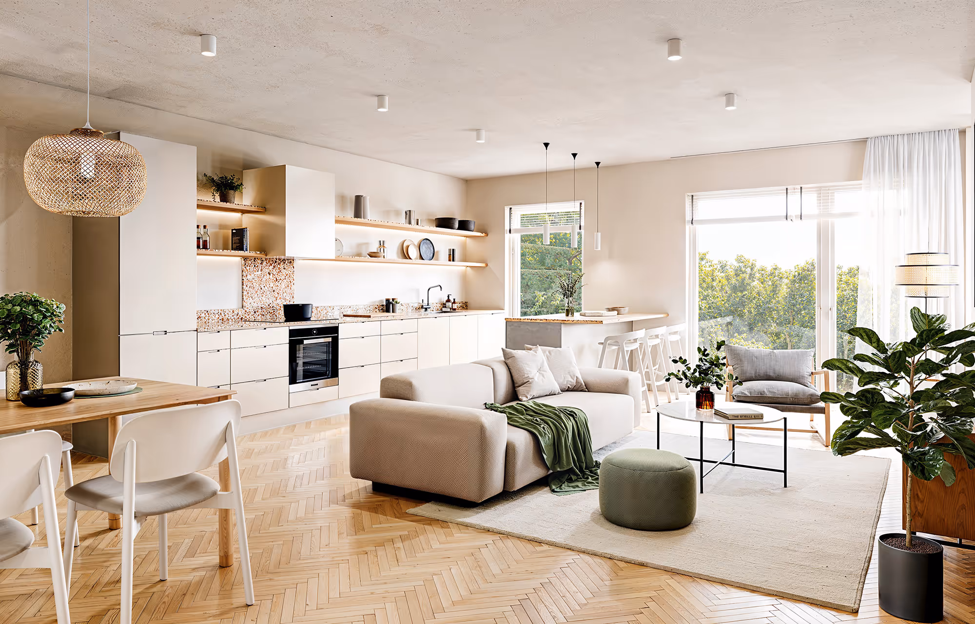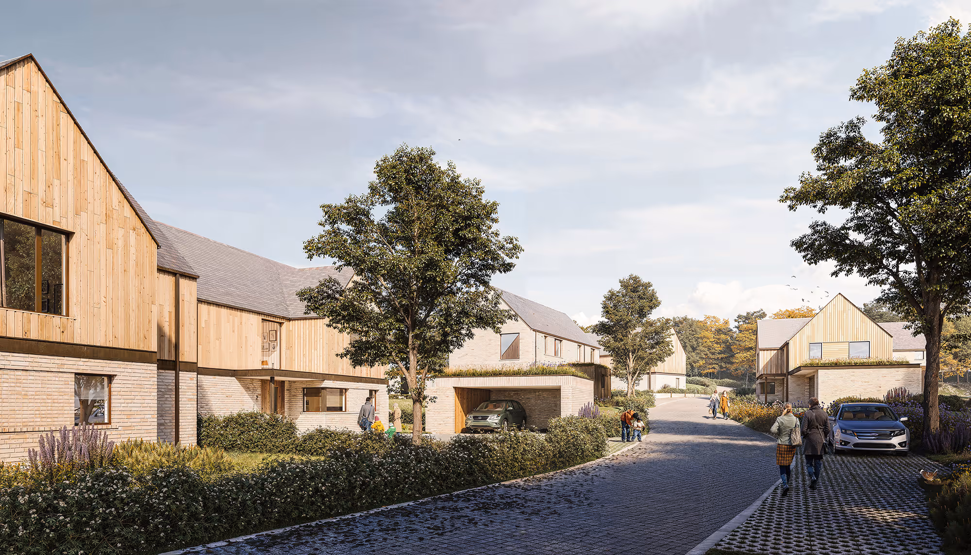 Created in close collaboration with Hollaway, this series of images supported the development of a new residential neighbourhood on the edge of Hythe. The visuals focus on the relationship between architecture, landscape, and everyday life, capturing a calm, grounded character across both external and interior spaces. Material qualities, light, and spatial rhythm were explored throughout the process, helping to communicate a clear design intent for a scheme shaped by its natural setting.