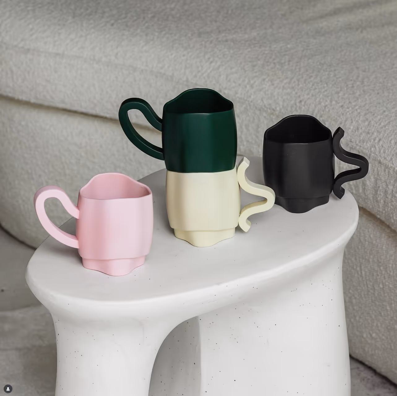 A collaborative collection developed with artist Lois O’Hara, translating her fluid, graphic prints into three-dimensional homewares. Colour, contour and handle geometry were explored through iterative digital modelling and prototyping, creating a family of stackable mugs and sculptural candleholders that retain the energy of the original artwork. The range is now being refined for production, balancing expressive forms with everyday function and durability.